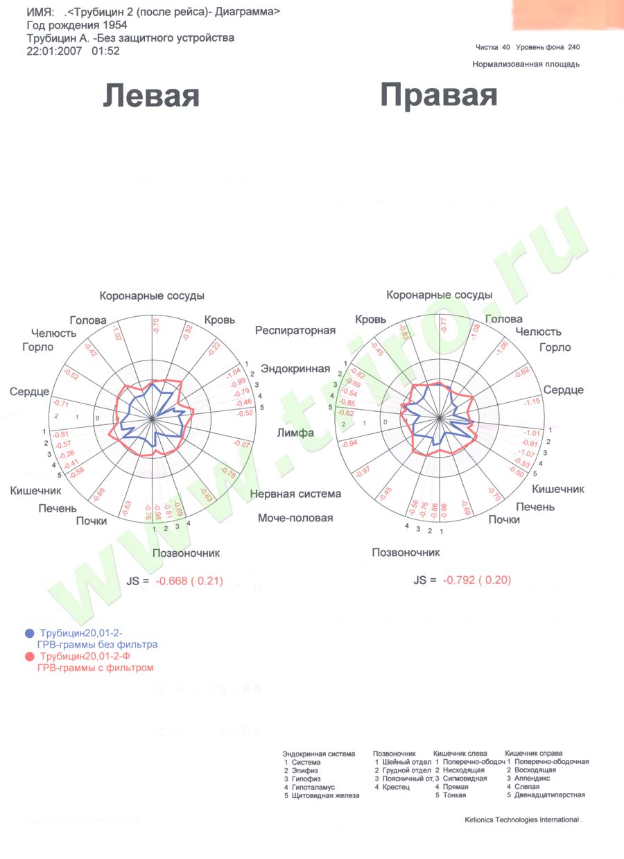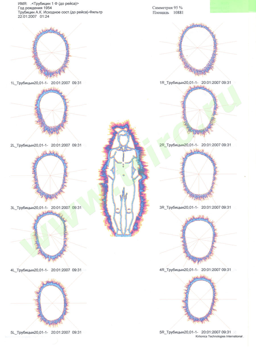 Показатели площади ауры с фильтром (Фильтр) отражают физическое состояние человека, показатели без фильтра (Б/Фильтра) отражают психоэмоциональное состояние.